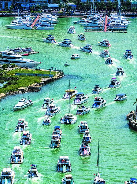 台风「麦德姆」来袭,海南三亚宣布全面停航,大批游艇昨天陆续回港避风。(中新社)