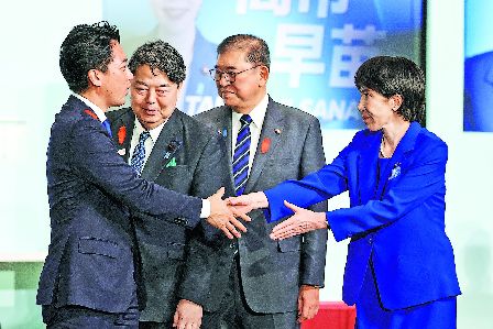 高市早苗(右一)当选日本自民党总裁后,跟次轮决选落败的农林水产相小泉进次郎(左一)握手,其间内阁官房长官林芳正(左二)和首相石破茂(右二)在两人身旁。(路透社)