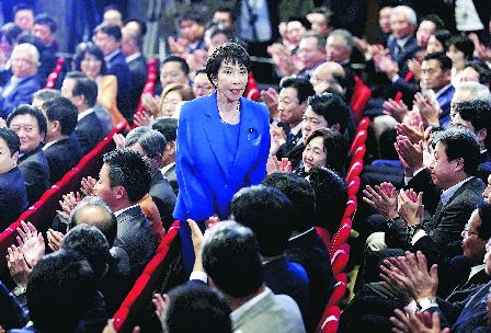 高市早苗昨当选日本自民党总裁后,站起来接受党友们的掌声祝贺。预料她将在本月中接任首相,创下女性担任日本首相的先河。(路透社)