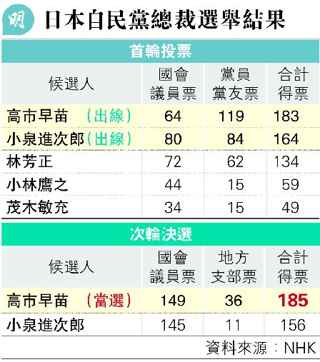 在首轮投票中,高市早苗在党员/党友票遥遥领前,即使议员票排第三,仍以首名出线,跟小泉进次郎对决。在次轮投票中,高市续在党员/党友票转化的都道府县党支部票领放,并在议员票意外反超,最终以29票优势当选。