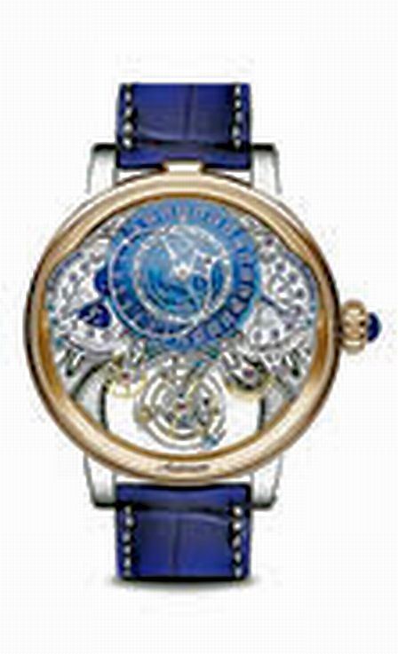 双面飞行陀飞轮:Recital 20 Asterium腕表搭载双面飞行陀飞轮,表背年历更能显示黄道十二宫,夏至、冬至、春分和秋分。(品牌提供)