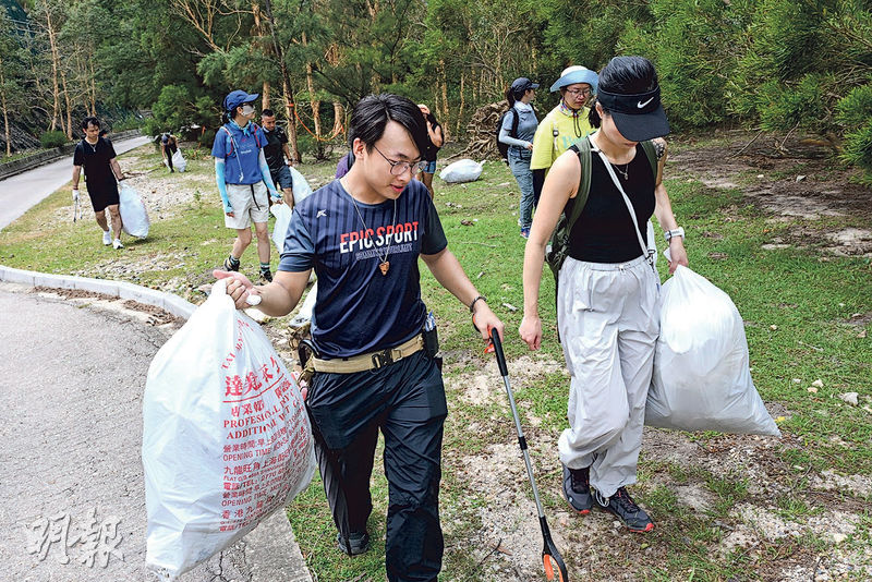 23岁从事地盘的Anson(前左)近半年透过社交媒体Threads认识山友Raymond,开始隔周上山拾垃圾,「自己的地方就要保护」。他希望以身作则,冀当游客看见时,可藉此增强大家的环境保护意识。(卢曼盈??o?J??
