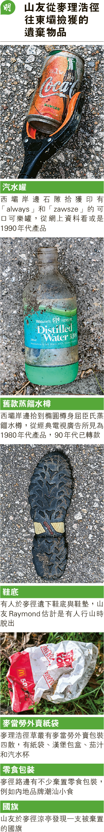 「有得休息的地方就会多烟头和食物包装。」Raymond一边对记者说、一边观察地面,每约5步一停,弯腰夹烟头。沿路发现麦当劳外卖包装四散,有纸袋、汉堡包盒、茄汁和汽水杯,可还原一个完整餐点。他用钳翻开纸袋,一窝蚂蚁即窜出,山友停下研究处理方法,最后拨走蚂蚁才放进袋,以免它们爬上手。