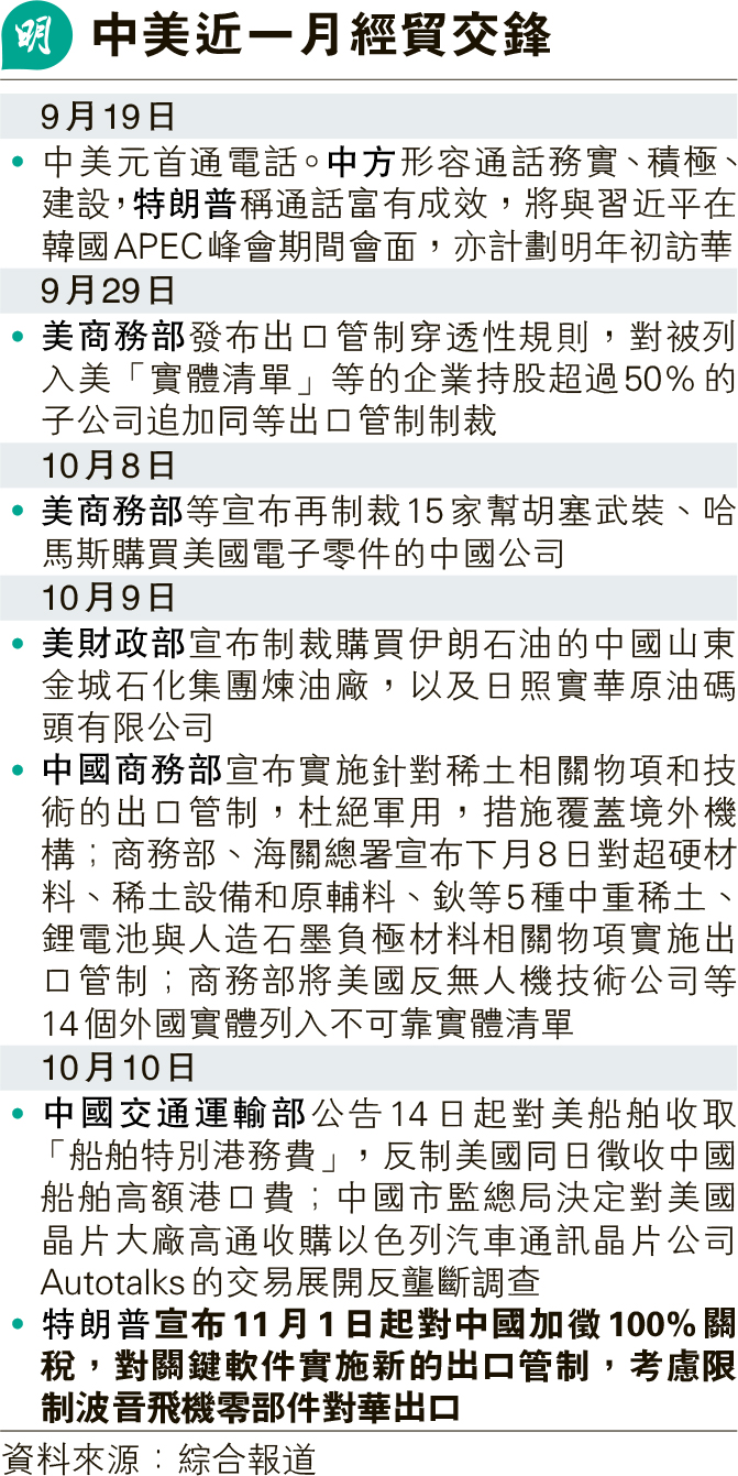 【明报专讯】中美「关税休兵」尚有一个月届满,两国贸战突然升温。美国总统特朗普上周五(10日)提出一系列反制中国稀土出口管制等新措施,包括计划11月1日起对中国商品加徵100%关税,以及对关键软件、飞机零部件等实施出口管制,威胁「还有许多其他反制措施也在认真考虑」。特朗普亦改口称没有取消月底韩国「习特会」,又暗示不排除在会晤后撤回加税决定。至截稿时中方未有回应。