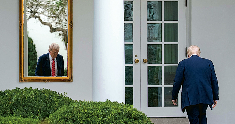 美国总统特朗普10日抵达白宫后,走向椭圆形办公室,新华社拍摄到墙上镜子映照出他垂头面容凝重。当天,特朗普提出将对中国输美商品额外加徵100%关税,以及对关键软件、飞机零部件等实施出口管制,以反制中国收紧稀土出口管制。(新华社)
