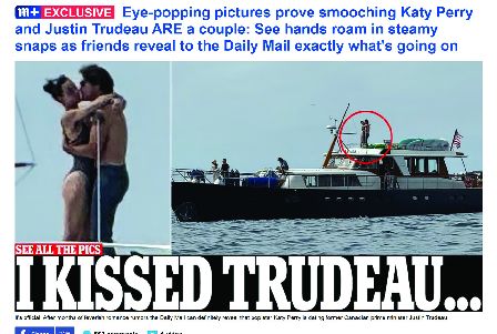 一名目击者表示:「她把游艇靠近一艘小型观鲸船,然后他们开始亲热。我一开始没认出她身边的人是谁,看到他手臂上的纹身才发现是杜鲁多。」另一消息人士向英国媒体透露,佩里对这位前自由党领袖「非常感兴趣」。「她认为他很优秀,是值得追求的人。虽然两人都很忙,也身处不同城市,但如果要谈远距离恋情,他绝对值得。