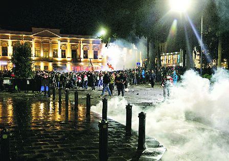 格鲁吉亚首都第比利斯前晚有示威者与警察对峙,后者施放催泪气体驱散人群。(路透社)