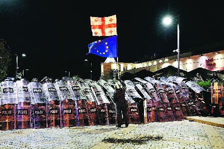 格鲁吉亚首都第比利斯上周六有民众参与反对派集会,在防暴警察面前挥动国旗及欧盟旗帜。(法新社)