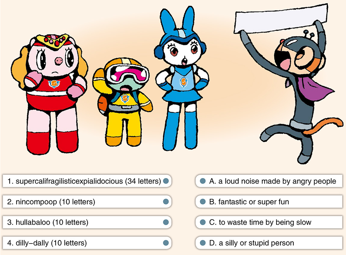 The Smarties are learning some new words. These words sound silly and interesting, but they are really long! Can you help guess the meaning of each word?