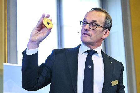 诺贝尔物理学委员会成员约翰松(Goeran Johansson)昨宣布今年物理学奖得主时,以道具说明今年物理学奖突破:把量子物理从微观带入晶片。 (法新社)