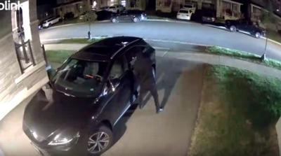 在警方公布的监控录像中,可以看到一名身穿全套深色衣服的歹徒,在某人的车道上靠近一辆黑色SUV,试图撬开后排乘客车门。