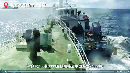 中国海警局新闻发言人刘德军昨日表示,菲律宾3002、3003号公务船当天未经中国政府允许,非法闯入中国南沙群岛铁线礁附近海域。上午9时19分,菲3003船无视中方多次严正警告,危险接近中方正常维权执法的海警21559艇,导致发生擦碰,责任完全在菲方。