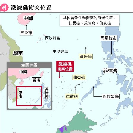 中菲在南海的冲突范围扩大,从早前的仁爱礁、黄岩岛,逐渐发展到仙宾礁和铁线礁海域。铁线礁位于南沙群岛北部,属中业群礁的一部分。今年1月24日,两艘菲律宾船只试图登上铁线礁采集砂样,遭中方驱离;5月21日,中菲公务船在该海域发生冲突,期间菲方人员登礁,随后中国海警人员登礁展示国旗宣示主权。