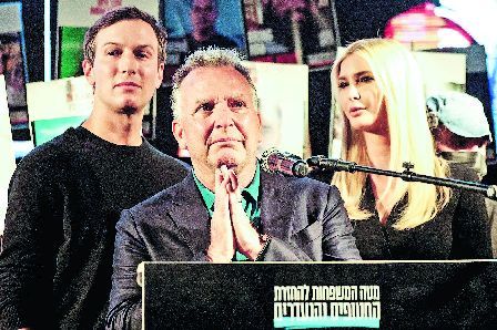 美国总统的中东问题特使威特科夫(中)上周六在特朗普的长女伊万卡(右)、女婿库什纳(左)陪同下,于以色列特拉维夫发表讲话。(路透社)