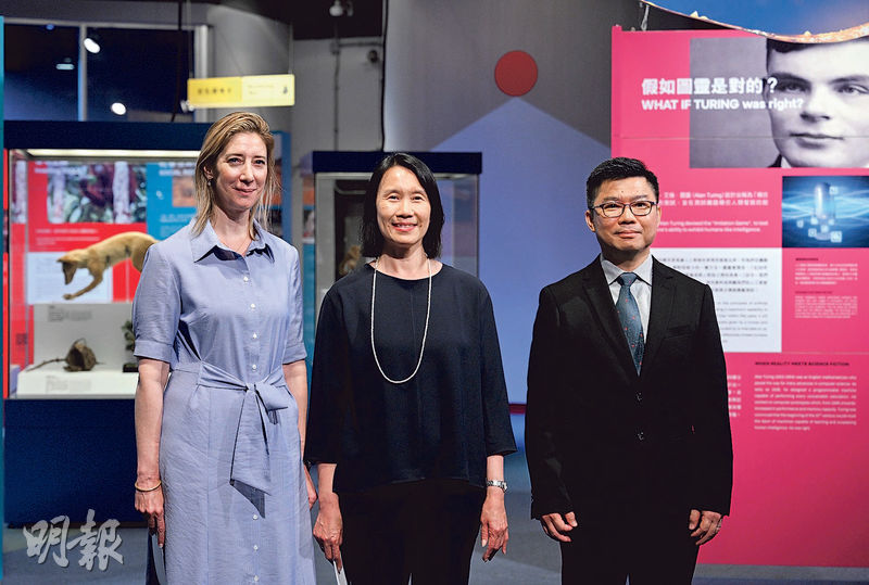 由香港科学馆科学??u广组同法国驻港澳总领事馆合办?「智能——万物有灵」展览今日开始,噚日举行开幕礼,法国驻港澳总领事杜丽缇(左起)、康文署长陈咏雯、科学馆总馆长刘启业主礼。(卢曼盈??o?J??
