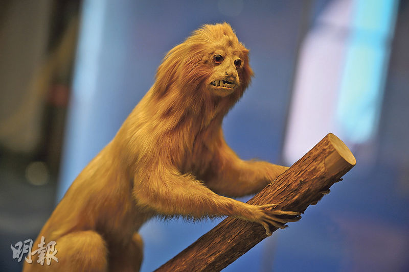 香港科学馆「智能——万物有灵」展览会展出由香港生物多样性博物馆提供?珍贵动物标本,包括金狮面狨。(卢曼盈??o?J??