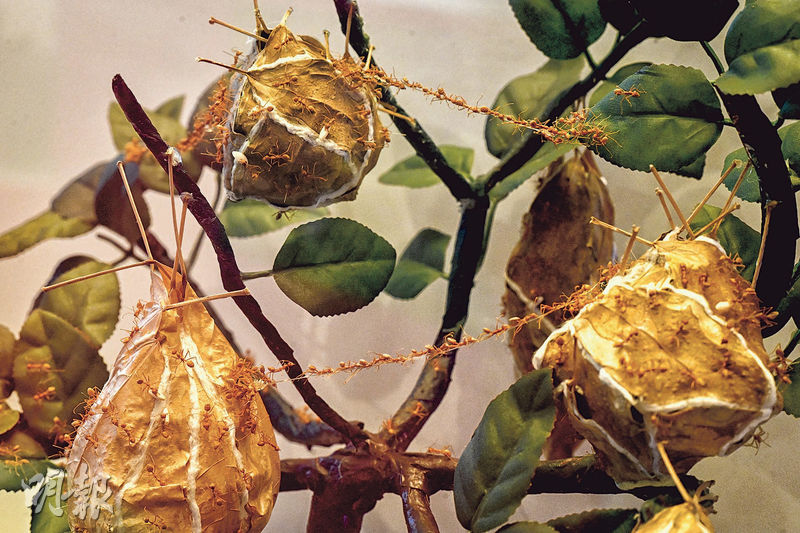 展览亦展出多种昆虫同雀鸟巢穴,其中黄?蚁(图)利用幼虫吐出?丝作为「胶水」将树叶黏合成巢穴。图为黄?蚁巢?自然实景模型。(卢曼盈??o?J??