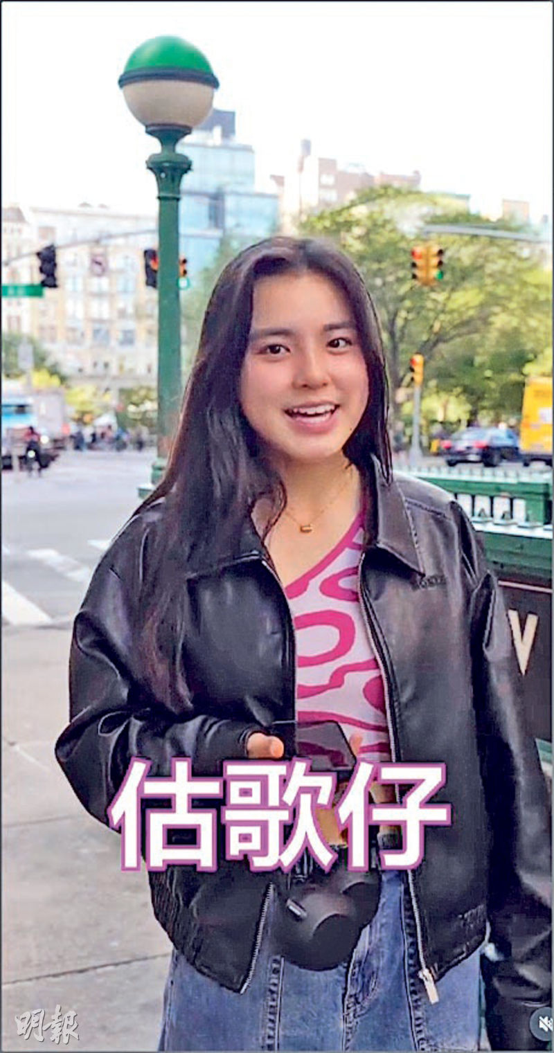 【明报专讯】姚焯菲(Chantel)8月底前往美国入读纽约大学,修读为期4年的Music Business课程,同校同学有李克勤长子李立仁(Ryan Lee)。Chantel很快便适应校园生活,日前在社交平台上载一段名为CHANTEL's GAME SHOW:《广东话 估歌仔 in New York EP.1》短片,片中她邀请不同文化背景的同学挑战「估歌仔」游戏,同学戴上耳机听歌并唱出广东歌词,过程爆笑。除了Chantel及参与的同学,连镜头后负责拍摄的摄影师也忍不住大笑。