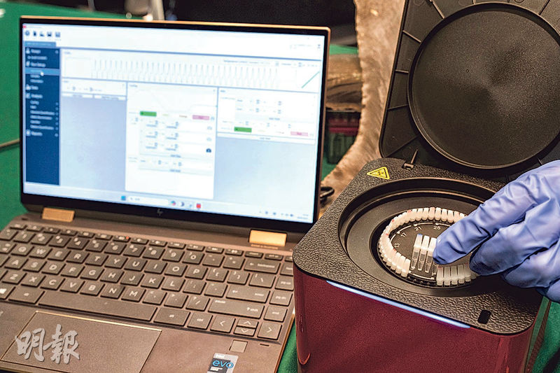 渔护署引入快速测试鱼翅基因技术,以一部桌上「即时定量聚合?连锁反应仪」,可同时处理48个鱼翅样本,最快两小时有结果,连接反应仪的电脑会显示各种曲线,对应不同鲨鱼物种。(冯凯键??o?J??