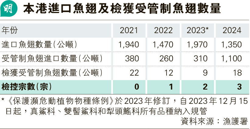 去年本港进口1350公吨鱼翅,较前年下降逾三成;去年整体入口鱼翅中,约八成为受管制物种,比例较以往大幅增加,主要原因是本港根据《濒危野生勾x??物种国际贸易公约》,于2023年修订本地的《保护濒危勾x??物物种条例》,自2023年12月15日起,将真鲨科、双髻鲨科和犁头鳐科所有鲨鱼品种均纳入规管,进出口均须先获渔护署签发许可证。这些鲨鱼鱼鳍制成的都是市面常见鱼翅,例如牙拣翅及海虎翅等。