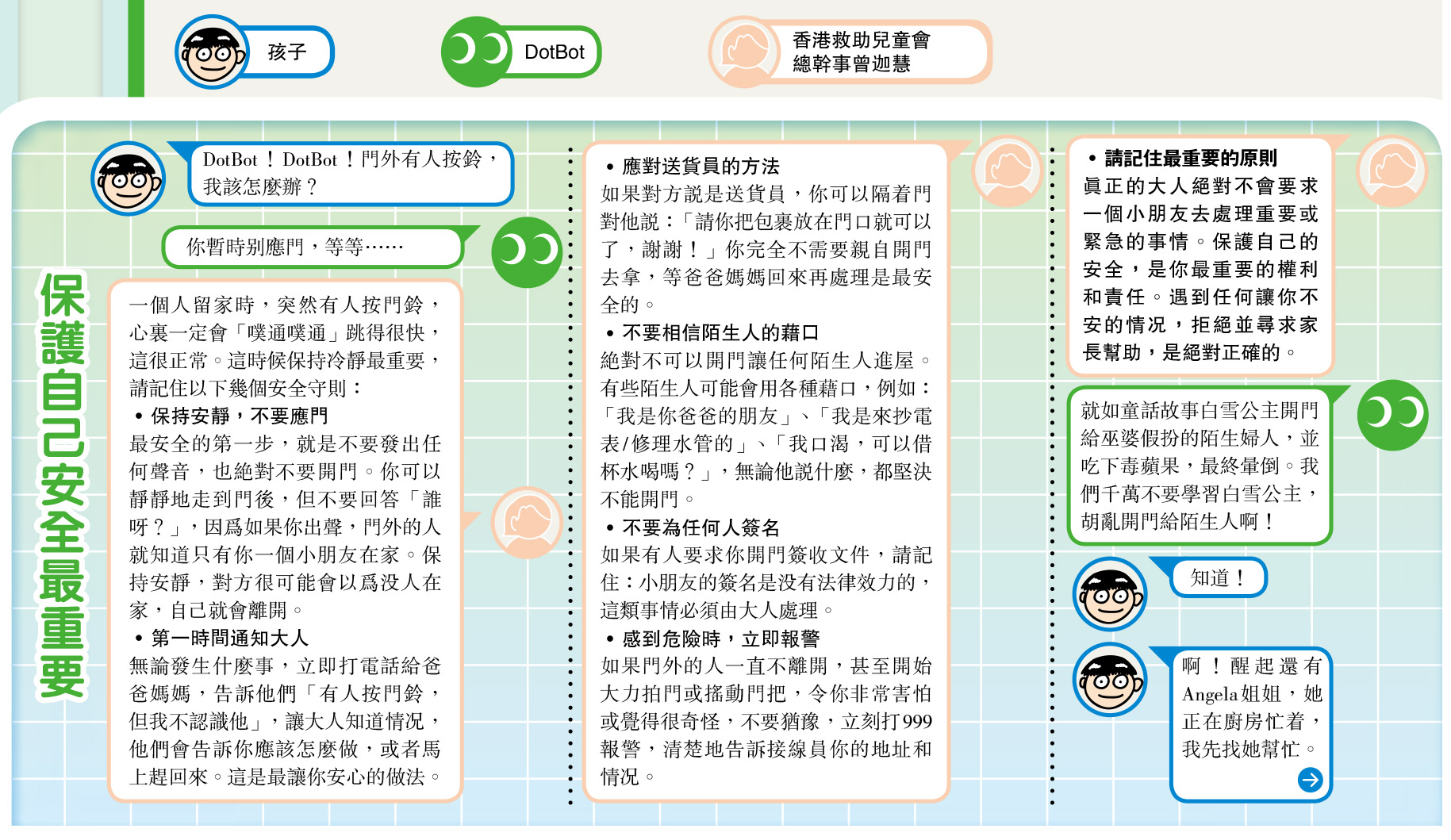 无论发生什么事,立即打电话给爸爸妈妈,告诉他们「有人按门铃,但我不认识他」,让大人知道情?,他们会告诉你应该怎么做,或者马上赶回来。这是最让你安心的做法。