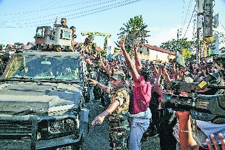 马达加斯加「陆军行政及特勤部队」(CAPSAT)部分成员上周六离开驻扎的军营前往首都塔那那利佛的513广场,获反政府示威者欢迎。(法新社)