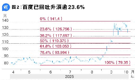 从技术走势分析,黄国英指出,阿里及百度早前股价急升后,上周均已经录得明显跌幅(编按:阿里及百度至上周五均已回吐是次升浪累积升幅逾23.6%,见图1及图2),予人的感觉是股价早前已经「炒爆」,对持货者属沉重的士气打击,料两股股价短期均难有好表现。