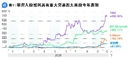 目前投资美股,除了科技龙头股外,黄国英认为更值得留意的是美国政府早前曾入股或与其有重大交易的四大美股──晶片股英特尔、锂矿股Lithium Americas Corp、稀土股MP Materials及铜矿股TMC the metals company Inc,指从美国政府扫货名单可见,晶片、稀土、锂矿及铜矿已被视为对工业、科技及军事至为重要的关键物料(strategic material),有关股票价格若因是次中美贸易战升温而显著调整,实属低吸良机。《Money Monday》翻查彭博数据显示,英特尔、Lithium Americas Corp、MP Materials及TMC the metals company Inc股价今年以来分别劲升81.39%、152.18%、402.17%及693.30%(见图3)。